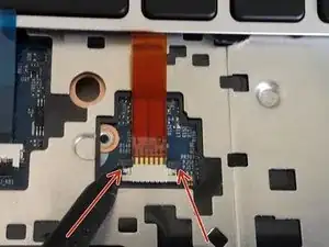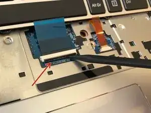 Используя пластиковую лопатку, поднимите фиксирующий замок на ZIF разъеме, удерживающем синюю гибкую плату, затем аккуратно извлеките плату из разъема.