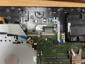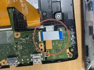 Поднимите материнскую плату в области кабеля клавиатуры. Теперь она должна быть достаточно свободна, чтобы увидеть ленту, которой прикреплён кабель клавиатуры