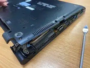 После выкручивания винтов с помощью плоского инструмента разъедините нижнюю часть корпуса по боковым сторонам, продвигаясь вдоль краёв ноутбука, пока нижняя крышка полностью не снимется.