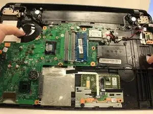 Винты, удерживающие клавиатуру, уже были удалены вместе с задней панелью, поэтому просто вытолкните клавиатуру из ноутбука, продев пальцы через отверстия под вентилятором и приводом компакт-дисков.