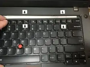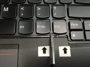 С помощью плоской отвертки или инструмента поднимите край с стрелочными клавишами клавиатуры, пока он не освободится над рамкой выше области для запястья.