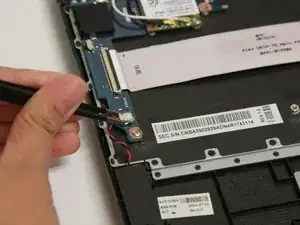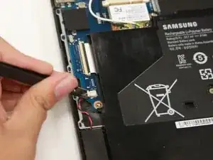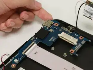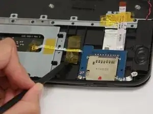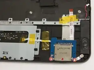 Используйте тупые пинцеты для точных работ, чтобы снять оба плоских кабеля, подключённых к считывателю SD‑карт.