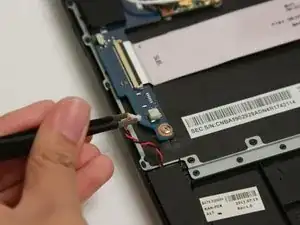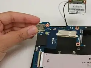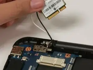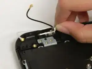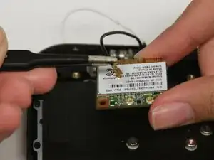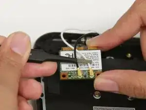 Используя тупые пинцеты для точных работ, снимите белый провод с Wi‑Fi карты.