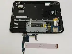 Снимите жёлтую ленту на левом плоском кабеле с помощью лопатки.