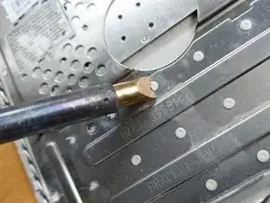 Используйте паяльник с большой насадкой, чтобы расплавить пластиковые заклепки, которые крепят металлический корпус клавиатуры.