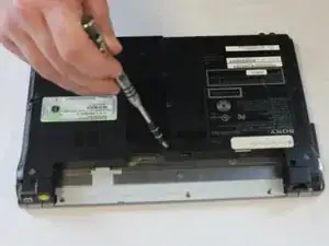 Удалите один винт Philips #1 с потайной головкой длиной 5 мм, находящийся в центре ноутбука, с помощью битодержателя с битой Philips PH1.