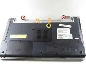 Переверните компьютер так, чтобы его нижняя часть была направлена вверх, а шарниры экрана (гнездо питания и кнопка включения) были повернуты от Вас.