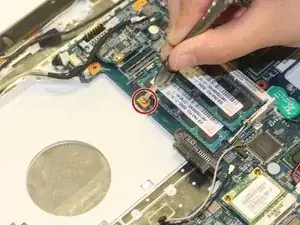 Аккуратно подденьте плоским концом приспособления под край Bluetooth-карты. Затем слегка подденьте этот край, чтобы освободить карту от материнской платы. (Смотрите третье изображение)