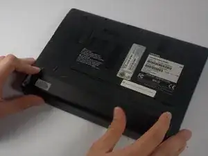 На нижней стороне ноутбука найдите две защёлки, показанные на изображении, и отведите обе их наружу — от батареи.