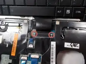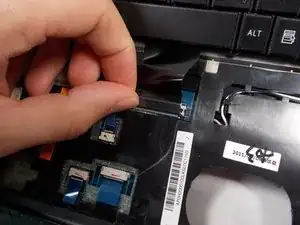 Найдите ленточный кабель под клавиатурой. Сдвиньте белые защёлки вперёд — клавиатура отсоединится.