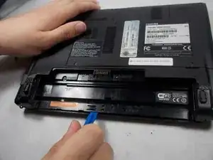 Продолжая отводить защёлки наружу, нажмите на выступы на батарее, отводя их от корпуса ноутбука.
