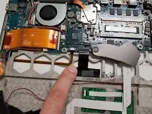 Отсоедините белый соединитель гибкого кабеля, аккуратно потянув его из разъёма. Следуйте руководству здесь.