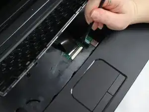 Как только клавиатура выскочит, используйте нейлоновую лопатку, чтобы отсоединить ленту или клапан, который соединяет заднюю часть клавиатуры с внутренней основой ноутбука.