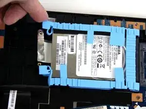 Жёсткий диск удерживается мягким синеним резиновым креплением. Крепление можно отсоединить, потянув вверх за две вкладки на левой стороне жёсткого диска, видимые на этих изображениях.