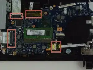 Отключите ленточные кабели, чтобы можно было откинуть ленточный кабель клавиатуры и освободить его.