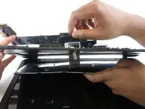 Протяните шлейф клавиатуры через держатель, полностью освобождая его от ноутбука.