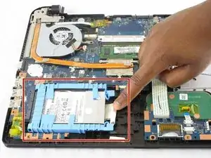 Отсоедините синюю ленту, подключающую устройство жёсткого диска к материнской плате, предварительно подняв жёлтую защитную ленту.