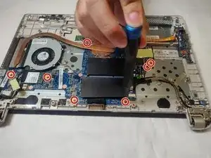 Поднимите в местах, оставшихся после извлечения аккумулятора, чтобы создать зазор между задней крышкой и корпусом ноутбука.