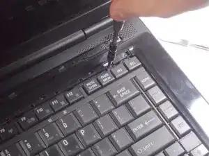 После того как вы отложите пластиковую накладку в сторону, найдите два винта, которые удерживают клавиатуру на ноутбуке.