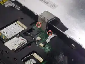 Аккуратно отключите клавиатуру от материнской платы, оттянув обе белые защелки от отсека, удерживающего провод.