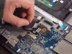 Отключите кабель аккумулятора от материнской платы, аккуратно потянув за чёрный провод в точке, ближайшей к белой защёлке.