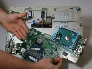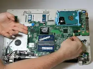 После того как все разъёмы отсоединены от материнской платы и область USB-порта освобождена, аккуратно приподнимите материнскую плату с обеих сторон и выньте её.