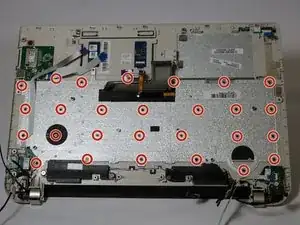 Удалите двадцать семь винтов Phillips #0 длиной 2 мм, которые крепят пластину крепления клавиатуры.
