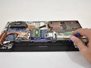 Вставьте пластиковый инструмент в край ноутбука и вскройте заднюю крышку.