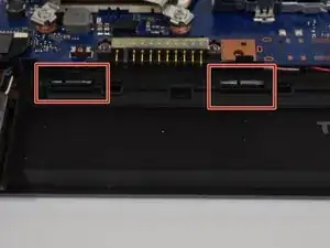 Переместите 4 маленьких язычка, расположенных вдоль пустого места для аккумулятора, в направлении, где находится аккумуляторный блок. Они должны оставаться не зацепленными без необходимости их удерживать.