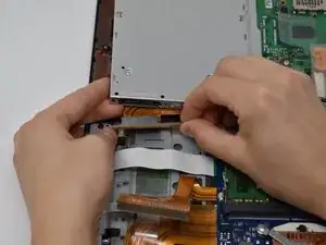 Нажмите два коричневых кронштейна к задней части компьютера и аккуратно вытяните ленту разъема.