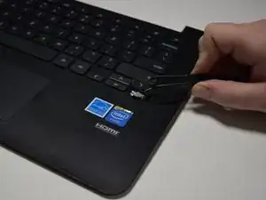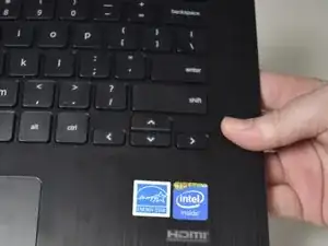 С помощью пластикового инструмента аккуратно пройдитесь по корпусу Chromebook, отделяя пластиковый корпус по шву.