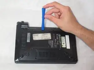С помощью пластикового инструмента для вскрытия снимите крышку отсека жёсткого диска, поддев её и подняв вверх.