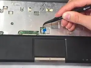 Пинцетом разблокируйте ленточный кабель тачпада, сдвинув белую фиксацию вправо.