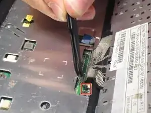 Пинцетом отсоедините кабель в нижней части клавиатуры, подняв вверх два фиксирующих флажка по обеим сторонам разъёма.
