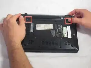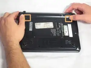 Переверните ноутбук и найдите фиксирующие защёлки батареи.