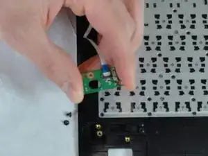 Положите клавиатуру с стороной клавиш вниз. Схема кнопки питания находится сразу под местом кнопки.