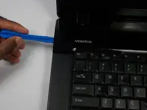 Используя пластиковый инструмент для открытия, надавите внутрь вдоль краев клавиатуры, чтобы освободить зажимы.