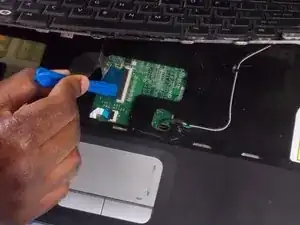 Сняв клавиатуру, используйте пластиковый инструмент, чтобы поднять черный зажим, удерживающий шлейф для кнопки питания.
