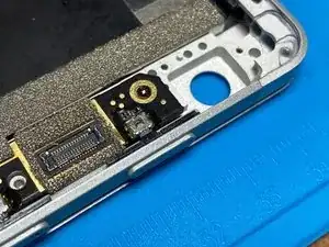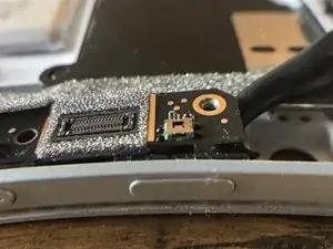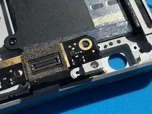 Начните с удаления шлейфа справа. С помощью изогнутых пинцетов аккуратно снимите металлическую скобу, чтобы открыть конец шлейфа. Снимите шлейф.