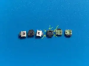 Примечание: процесс снятия кнопок может привести к попаданию флюса внутрь кнопки, и она может перестать щёлкать при нажатии. Со мной так и было. Я не нашёл способа очистить кнопку без её повреждения. К сожалению, может потребоваться большее усилие при нажатии, чтобы включать и выключать устройство.