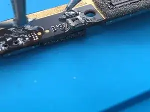 Осторожно удалите черную эпоксидную смолу, покрывающую контактные площадки на кнопке, с платы только для запчастей Microsoft Surface Book 1703 с помощью ножа X-ACTO.