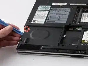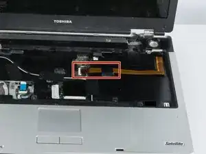 Оттяните коричневый шлейф от разъёма, расположенного в центре основания ноутбука.