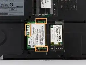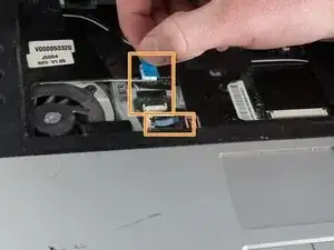 Оттяните два других белых шлейфа от разъёма, расположенного ближе к верхней правой части основания ноутбука.