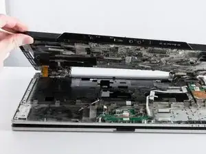 Отключите большой белый шлейф и проведите шлейф через верхнюю часть корпуса, пока поднимаете корпус от основания ноутбука.