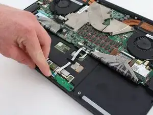 Снимите заднюю панель с ноутбука, сдвинув её от петель.