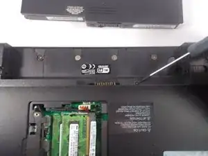Поверните компьютер так, чтобы батарея теперь была в верхней части устройства. Затем открутите один винт, расположенный в верхнем левом углу корпуса RAM, как показано.