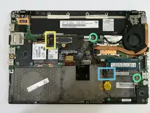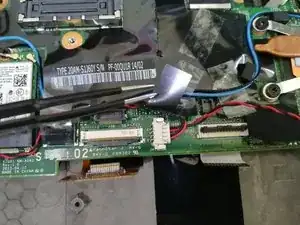 Извлеките материнскую плату, поддев ее вправо под зажимом, отмеченным синим рядом с батареей BIOS, и аккуратно переместите ее назад к верхней части ноутбука.