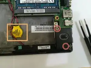 Снимите ленту, удерживающую батарею BIOS, отмеченную оранжевым.