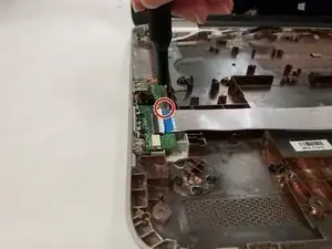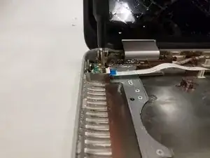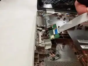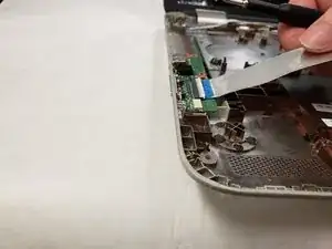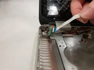 Отключите шлейф сенсорной панели, отогнув чёрную пластиковую защёлку на разъёме и вытянув шлейф из разъёма.
