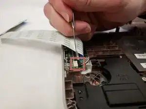 Отключите шлейф клавиатуры, отогнув чёрную пластиковую защёлку на разъёме и вытянув шлейф из разъёма.